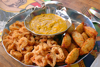 Anéis de lula fritos e bolinho de arroz cremoso